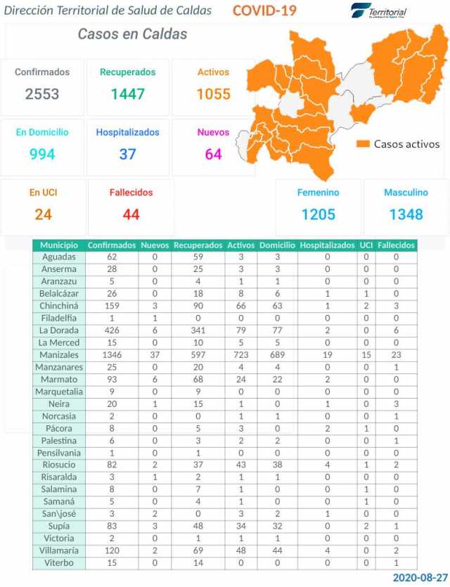 Caldas asciende a 2.553 contagiados.