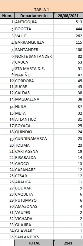 En cuanto los nuevos contagios, la estadística la lideraron Antioquia (513), Bogotá (444), Valle del Cauca (262), Atlántico (146) y Santander (100).