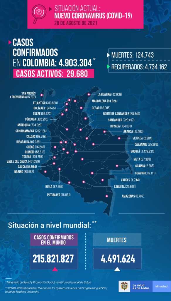 Según la cifras diarias del Ministerio de Salud, en el país aún hay 29.680 casos activos y la región que más infecciones acumula es Bogotá con 1.439.931, seguida de los departamentos de Antioquia (734.626), Valle del Cauca (401.239), Atlántico (313.538) y Cundinamarca (262.126).