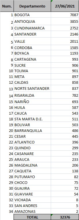 Bogotá volvió a sumar en esta jornada la mayor cantidad de contagios, aunque con un ligero descenso respecto a días anteriores, y 7.087 casos se produjeron en la capital, seguida de Antioquia (3.855), Cundinamarca (2.752), Santander (2.146), Valle del Cauca (2.011) y Córdoba (1.585).