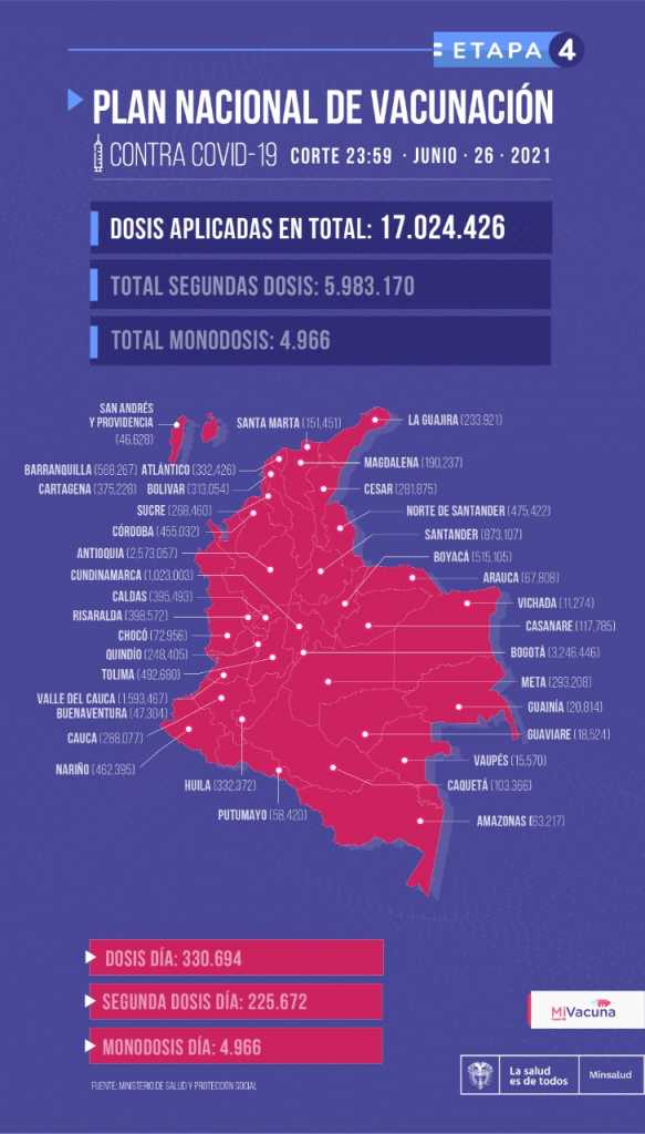 "Ayer 27 de junio de 2021, (...) cumplimos la meta de vacunar 17 millones de colombianos que se había especificado para el final del mes de junio, esta meta se logra cuatro días antes", dijo hoy el ministro de Salud, Fernando Ruiz.