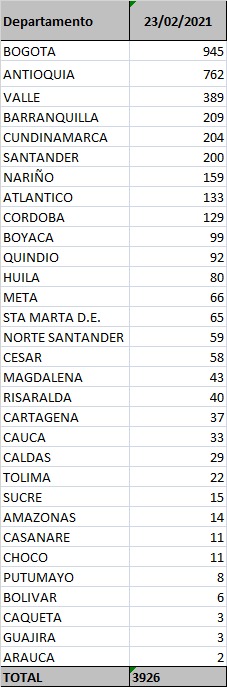 Según datos de la cartera de Sanidad, 945 de las nuevas infecciones estuvieron en Bogotá, ciudad a la que siguieron en cifras los departamentos de Antioquia (762) y Valle del Cauca (389).