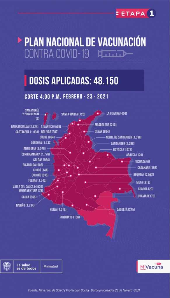 Colombia inició el pasado miércoles la vacunación contra la covid-19 y hasta la fecha ha aplicado 45.166 dosis distribuidas en todo el territorio nacional.