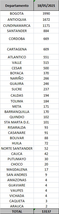 La capital colombiana también reportó la mayor cantidad de decesos al agregar 115, seguida por Antioquia (73), Valle del Cauca (39), Atlántico (38), Cundinamarca (33), Santander (21), Boyacá (18), Magdalena (17), Nariño (15), Caldas y Cesar (13), y Tolima (11).