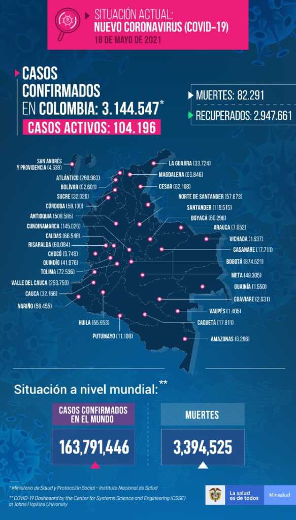 Colombia sumó este martes 13.137 nuevos contagios por coronavirus y 482 fallecimientos, con lo que totaliza 3.144.547 infecciones y 82.291 muertes, según los datos oficiales del Ministerio de Salud.