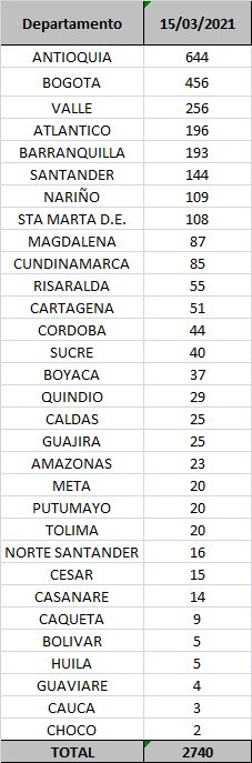 Colombia sumó este lunes 2.740 contagios por el coronavirus SARS-CoV-2 y otras 100 muertes por la covid-19, con lo que totaliza 2.305.884 casos y 61.243 fallecidos, según los datos del Ministerio de Salud.