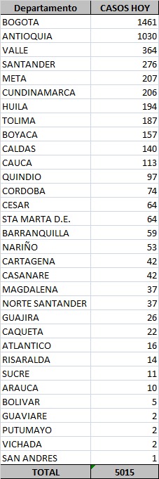 En cuanto a los contagios nuevos, el Ministerio señaló que 1.461 fueron detectados en Bogotá, 1.030 en Antioquia, 364 en Valle del Cauca, 276 en Santander, 207 en Meta y 206 en Cundinamarca, las regiones con los números más altos de la jornada.