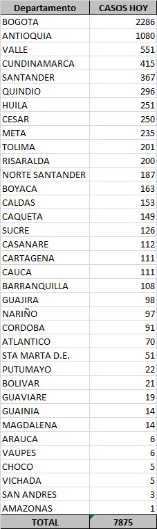 Según el boletín diario del Ministerio de Salud, además hubo cifras elevadas de contagios en Bogotá (2.286), Antioquia (1.080), Valle del Cauca (551), Cundinamarca (415), Santander (367), Quindío (296), Huila (251), Cesar (250), Meta (235), Tolima (201) y Risaralda (200).