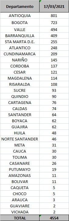 Según el informe diario del Ministerio de Salud, la región que más infecciones registró hoy fue el departamento de Antioquia con 801, seguido de Bogotá (723), Atlántico (657), Valle del Cauca (494) y Magdalena (369).
