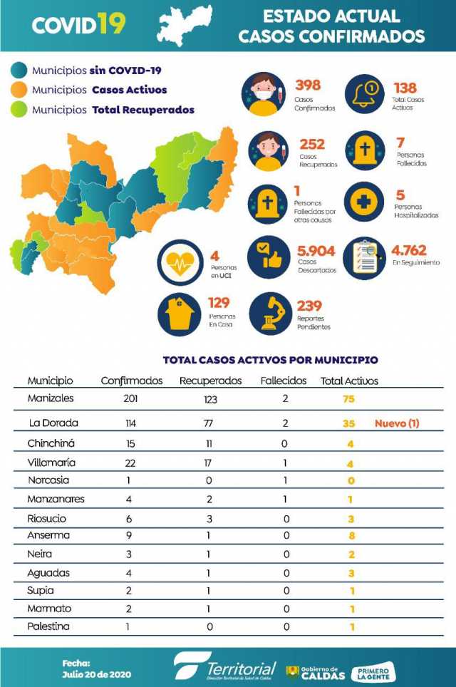 La Dirección Territorial de Salud de Caldas confirmó hoy un nuevo caso en el municpio de La Dorada. El departamento llega así a 398 contagios, de los cuales 252 se han recuperado y 138 permanecen activos.