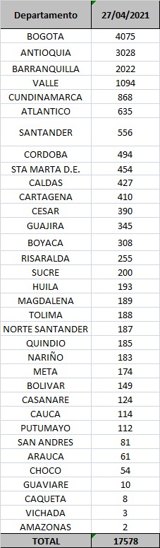 En cuanto a los contagios del día, la estadística la lideran Bogotá (4.075), Antioquia (3.028), Atlántico (2.657), Valle del Cauca (1.094) y Cundinamarca (868).