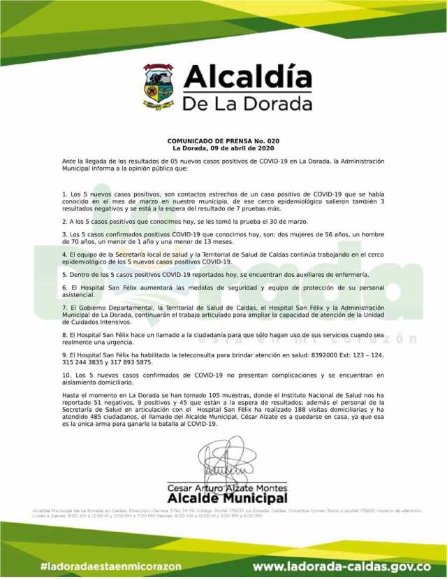 Arango enfatizó que le pide a la población de La Dorada que no venga al hospital si no es absolutamente necesario. "Es muy difícil si usted viene por otra circunstancia, que le podamos garantizar que no tendrá un posible contagio".