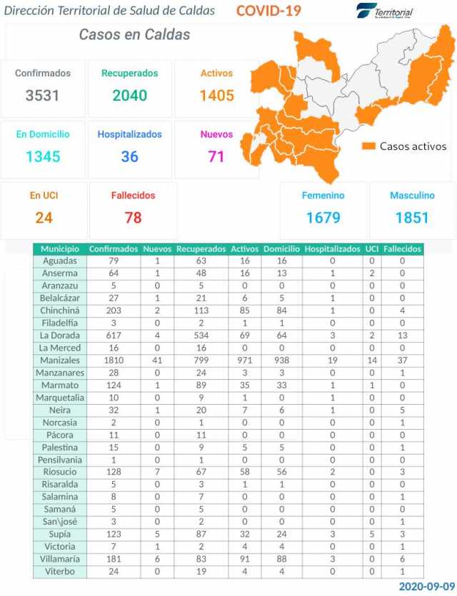 Coronavirus: 71 nuevos casos en Caldas y dos fallecidos en Manizales