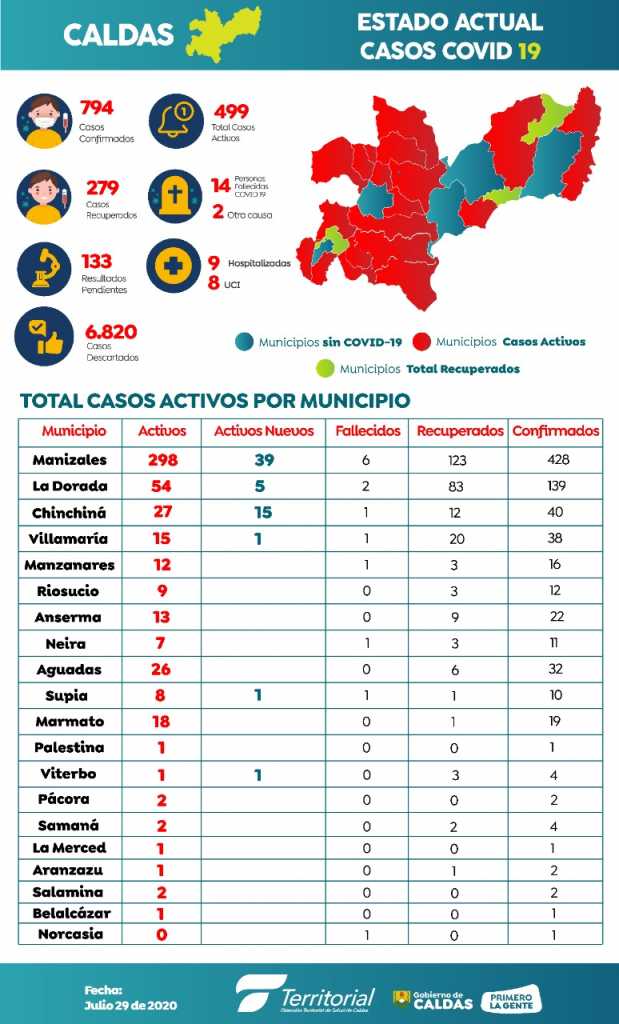 La Dirección Territorial de Salud de Caldas reportó este miércoles 62 nuevos contagiospor covid-19 en el departamento, con lo que son 794 las personas que se han contagiado en Caldas. De estas hay 499 que están activos con el virus.