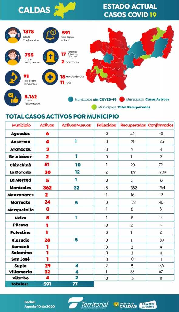 Este lunes la Dirección Territorial de Salud de Caldas reportó 77 nuevos contagios por covid-19, con los que se llega así a 1.378.