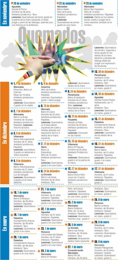 De 30 quemados con pólvora en Caldas, 6 son menores de edad. Es el balance del 1 de diciembre del año anterior y el 14 de enero de este año. Esto sin contar los dos menores y un adulto lesionados en noviembre pasado, que de acuerdo con el período epidemiológico del Ministerio de Salud no entran en las estadísticas actuales.