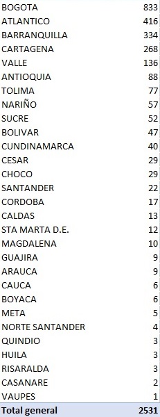 Hoy se procesaron: 16.015 pruebas. Hay 416 conglomerados en el país. Los territorios son: Amazonas, Antioquia (Ituango), Arauca, Atlántico, Barranquilla, Bogotá, Boyacá, Bolívar, Buenaventura, Caldas, Cali, Caquetá, Cartagena, Cauca, Cesar, Chocó, Córdoba, Cundinamarca, Huila, La Guajira, Magdalena, Meta, Nariño, Norte de Santander, Quindío, Risaralda, San Andrés, Santa Marta, Santander, Sucre, Tolima, Valle, Vaupés, Vichada, Guaviare y Guainía.