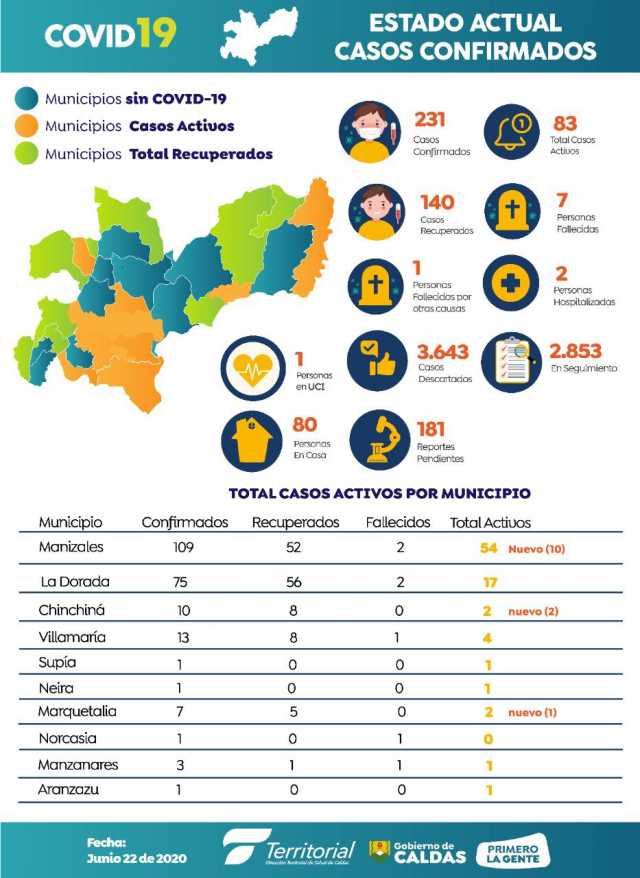 Los contagios en el departamento son 10 en Manizales, dos en Chinchiná y uno en Marquetalia. Hasta el momento en Caldas se han confirmado 231 casos, de los cuales 140 se han recuperado, 7 fallecieron y 83 permanecen activos.