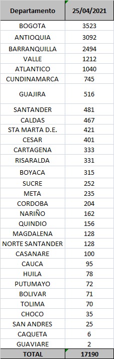 Los otros fallecimientos ocurrieron principalmente en Atlántico (92), Bogotá (73), Valle del Cauca (37), Magdalena (26), Cundinamarca (17), y La Guajira y Santander (cada una con 12).