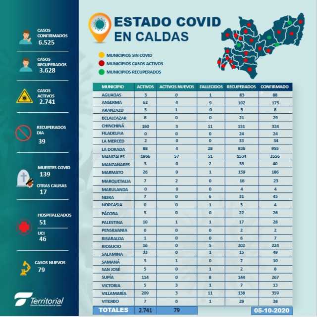 Casos de hoy: Manizales 57, Anserma 4, La Dorada 4, Chinchiná 3, Victoria 3, Villamaría 3, Marquetalia 2, Aranzazu 1, palestina 1 y Samaná 1.