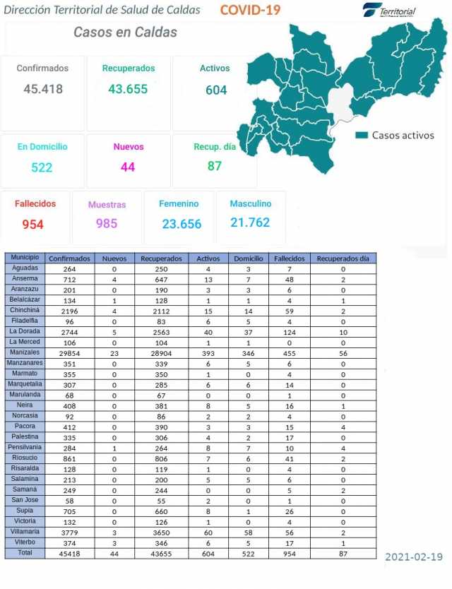 La Dirección Territorial de Salud de Caldas reportó este viernes 44 nuevos casos de covid-19, con lo que el departamento llegó a 45.418 contagios desde que comenzó la pandemia.
