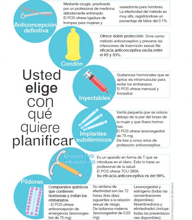 Conozca cuáles son los métodos de anticoncepción que le ofrece el Plan Obligatorio de Salud (POS). Para solicitarlo debe pedir una consulta de planificación familiar en su EPS o IPS. Allí, junto con el profesional de la salud, usted puede elegir el método que desee, previa recomendación médica.