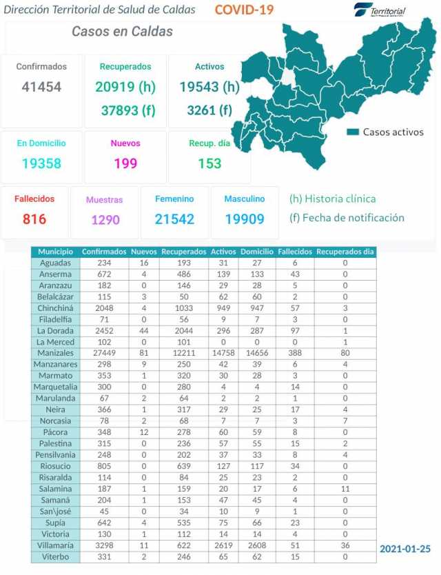 199 casos nuevos y 8 personas fallecidas es el reporte de la covid-19 ayer en Caldas, según el informe de la Dirección Territorial de Salud. Con los nuevos contagios, el departamento asciende a 41.454 confirmados y 816 decesos.
