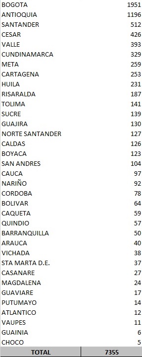 El resto sucedieron en Bolívar, Cauca, Quindío y Risaralda (4), Nariño (3), Atlántico, Magdalena, Arauca, Caquetá, Tolima y Caldas (2), y Sucre, Casanare y Vaupés (1).