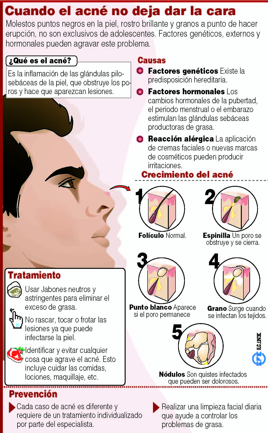 Algunos de los factores que generan la aparición de esta afección son el cambio hormonal durante la adolescencia, el estrés, los cosméticos grasosos, algunos medicamentos, entre otros.