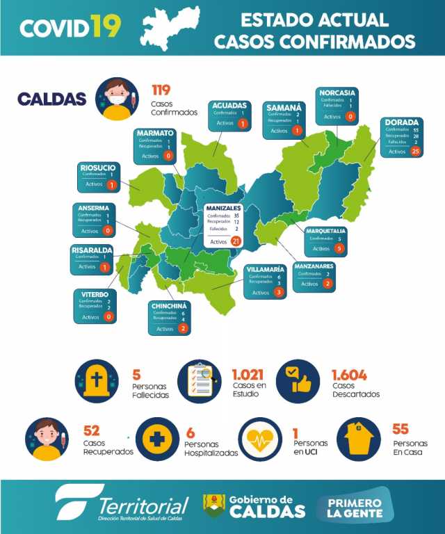 En el municipio de Chinchiná hay una mujer de 47 años hospitalizada y un hombre de 32 que permanece en su residencia. También hay otros dos positivos en Manzanares, un hombre de 48 años remitido a la Unidad de Cuidado Intensivo en un Hospital de Manizales y una mujer de 20 años aislada en casa.
