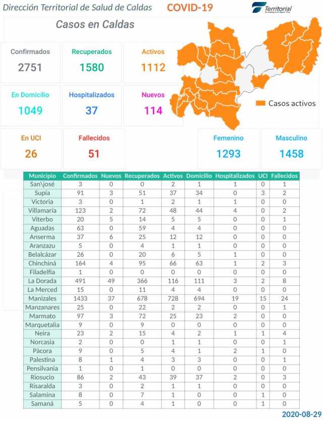 En Caldas 2.751 personas han sido confirmadas con covid-19, 1.580 se han recuperado, 1.112 permanecen activos (1.049 están en casa, 37 hospitalizados y 26 en UCI) y 51 han muerto.