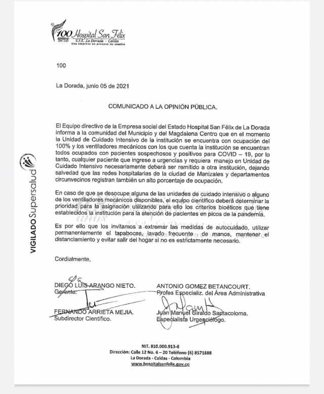 La entidad también informó de 15 personas fallecidas por coronavirus: 8 en Manizales, 1 en Riosucio, 1 en Pácora, 2 en Manzanares, 1 en Villamaría y 2 en La Dorada. Además 2 personas fallecidas por otras causas, 1 en Manizales y 1 en Marulanda.