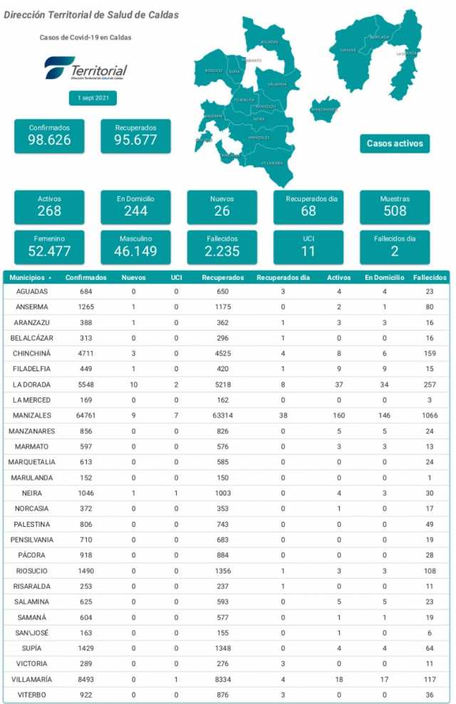 La Dirección Territorial de Salud de Caldas reportó este miércoles 26 nuevos contagios de covid-19, con esta cifra asciende a 98.626 casos confirmados.