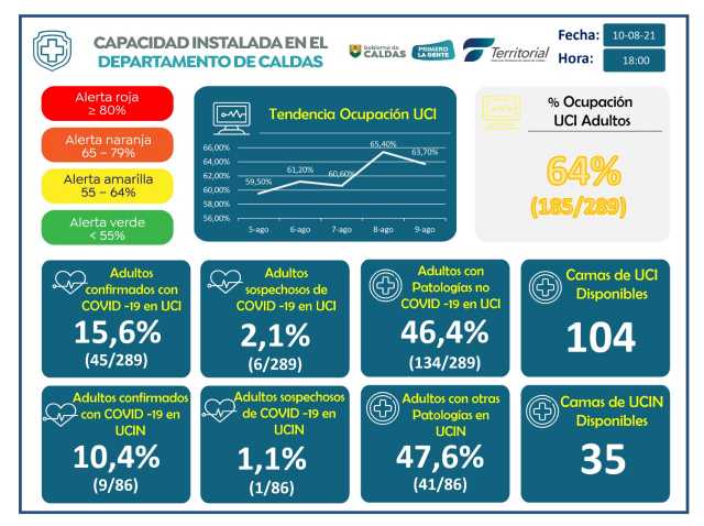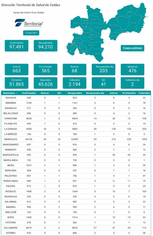 La Dirección Territorial de Salud de Caldas reportó 68 nuevos casos de covid-19, con esta cifra el departamento asciende a 97.491 confirmados.