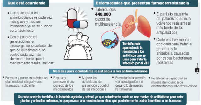 El uso indebido de estos fármacos en el ser humano y los animales acelera el proceso y cada vez es mayor el número de infecciones - como neumonía, tuberculosis y gonorrea- cuyo tratamiento se torna más difícil debido a la pérdida de eficacia de estas concentraciones, advierte la organización.