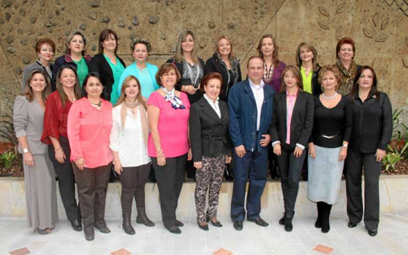 Piedad Gómez Vélez, Martha Ramírez Aristizábal, Luz Elena Giraldo de Ardila, Martha Elena Castro Rincón, Yarima Palacio de Trujillo, Nelly Gómez de Amariles, teniente coronel Juan Carlos Galán Galán, Mónica Villareal Peña, Ángela María Gómez de Cárdenas y Ana Cecilia Gómez Gutiérrez. Atrás: Consuelo Duque de Velásquez, María Clemencia Gómez González, Marleny López Vega, Janeth Meza López, Paula Tatiana Henao Londoño, Amparo Quintero Londoño, Esperanza Ocampo de Mejía, Ana Lucía Hoyos Aristizábal y Dora Jiménez de Arango.