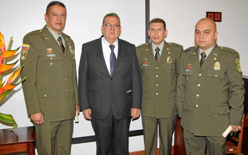 Juan Martín Hoyos Villegas, gobernador encargado de Caldas impuso el Escudo de Caldas en la categoría Gran Escudo a un grupo de policías por su destacado desempeño a beneficio de las instituciones, desarrollo social y solidaridad ciudadana.