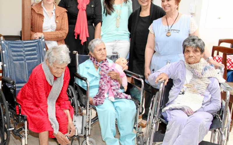 Adulto mayores de instituciones de la ciudad recibieron las bufandas tejidas por señoras, que como voluntarias se vincularon a la campaña que organizó almacenes Artelanas y Veruska, con el patrocinio de hilos Coats Cadena.