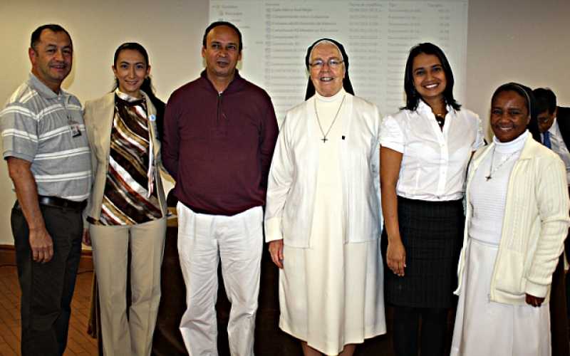 De la Universidad Católica de Manizales aparecen: Gustavo Arias Arteaga, docente; Diana Carmona González, directora de la maestría de Educación; Samuel Patiño Agudelo, director del grupo de investigación; hermana Gloria del Carmen Torres Bustamante, rectora; Paula Andrea Restrepo García, directora del Instituto Pedagógico, y hermana Luz Mery Chaverra Rodríguez, decana de la facultad de Educación.