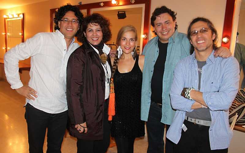 Orlando Sandoval, pianista y director de Mandala Chill; Claudia Villegas Yepes, coordinadora del Área Cultural del Banco de la República; Daniela de Mari, cantante de la agrupación; Mario Baracaldo, bajista, y Germán Sandoval, percusionista de Mandala Chill.