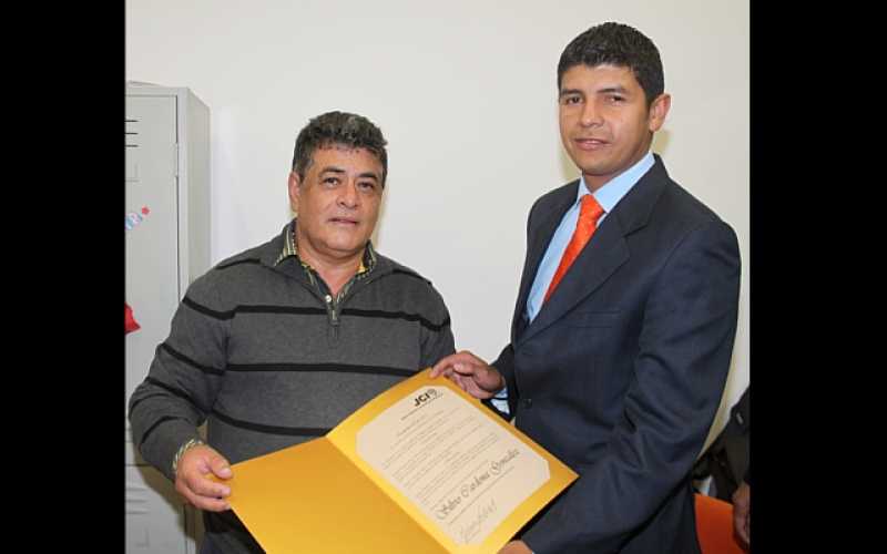 Silvio Cardona González recibió una resolución de reconocimiento que le entregó Robinson Hurtado Blandón, en representación de la Cámara Junior de Manizales.