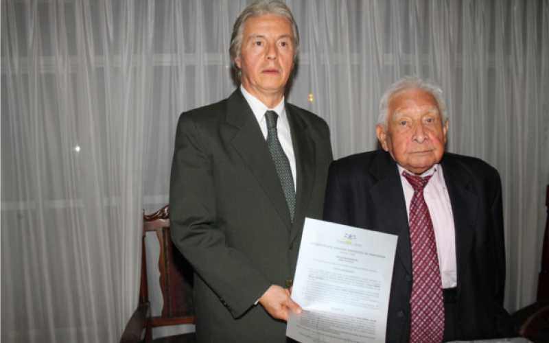 Carlos Enrique Cárdenas Aristizábal, presidente de la Corporación Colegio Nacional de Abogados (Conalbos), seccional Caldas, hizo entrega al señor Gabriel Trejos Espinoza de la resolución que lo acredita como miembro honorario de Conalbos.