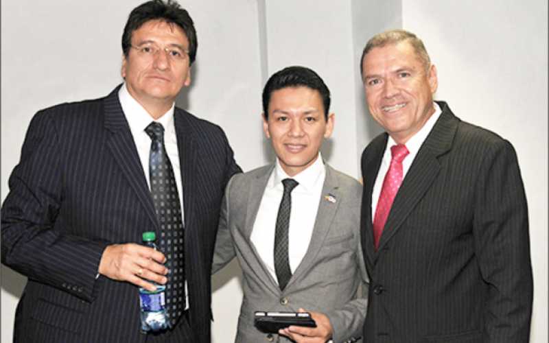 En la foto, de izquierda a derecha: Coordinador evento: Carlos Alberto Cortés Carrillo, Conferencista: Yokoi Kenji Díaz y Gerente Cooprocal: Leonidas Londoño Granada.