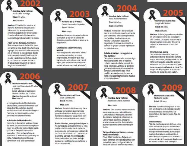 En Chinchiná lamentaron el asesinato de un joven por robarle una bicicleta, en Manizales la de un soldado que estaba de descanso, en Motebonito la de tres personas por un ataque guerrillerro, en Pácora la de un líder comunal por acción de paramilitares, en Villamaría por la de una joven en un supuesto crimen pasional.
