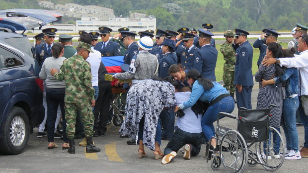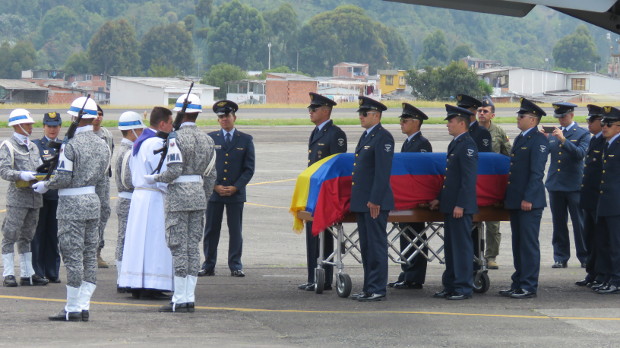 El helicóptero se dirigía al Comando Aéreo de Mantenimiento localizado en la población de Madrid, en las afueras de Bogotá. A su llegada sonó la trompeta, con la presencia de su familia, y se enalteció la labor de este héroe de la patria. Ayer fueron las exequias.