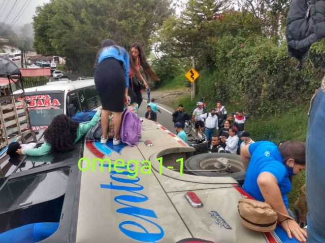 De otro, hubo un volcamiento de un bus de servicio público en la vía Manizales-Medellín, por Santa Bárbara. Los mismos ocupantes se ayudaron y salieron por sus propios medios, a la espera de organismos de socorro. Ocurrieron hace unos minutos.