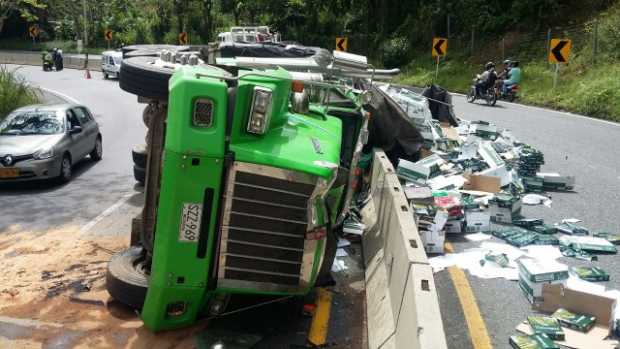 Un camión que venía de Caloto (Cauca) a Manizales con 34 toneladas de resmas de papel se volcó un kilómetro más abajo de La Estampilla, en la doble calzada a Chinchiná.