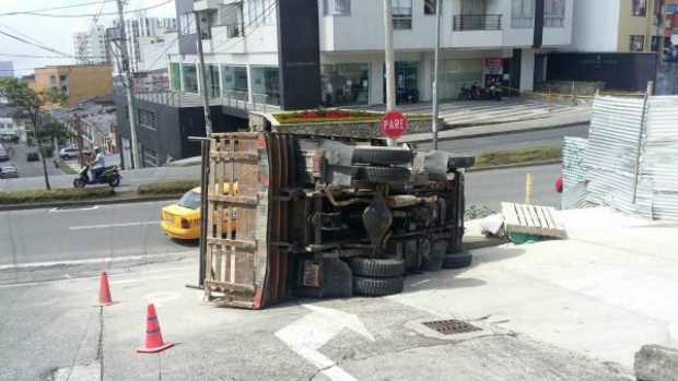El vehículo, que transportaba cemento para la obra que se realiza en el sector, perdió estabilidad producto del peso del material.
