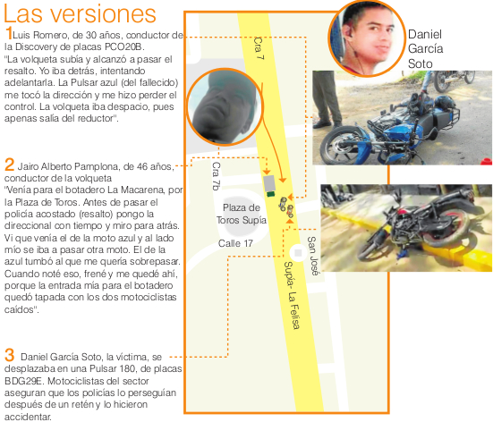 En la tarde de ese día, Yohany Díaz León, habitante de Supía, subió a Facebook fotos y un video donde se ven las motos implicadas después del accidente y a dos policías de carreteras haciendo el croquis.