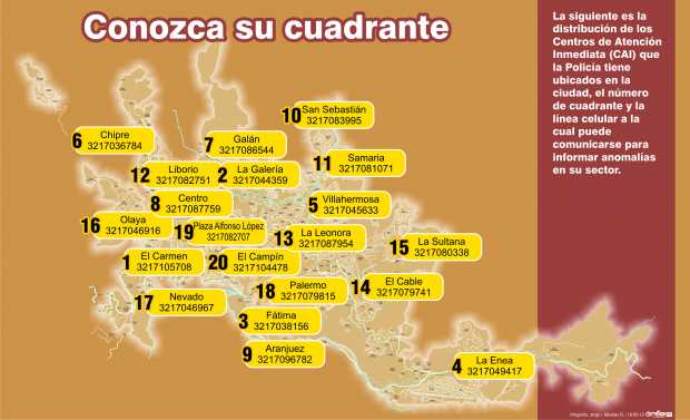 Encuentre la distribución de los Centros de Atención Inmediata (CAI) que la Policía tiene ubicados en la ciudad, el número de cuadrante y la línea celular a la cual puede comunicarse para informar anomalías en su sector.